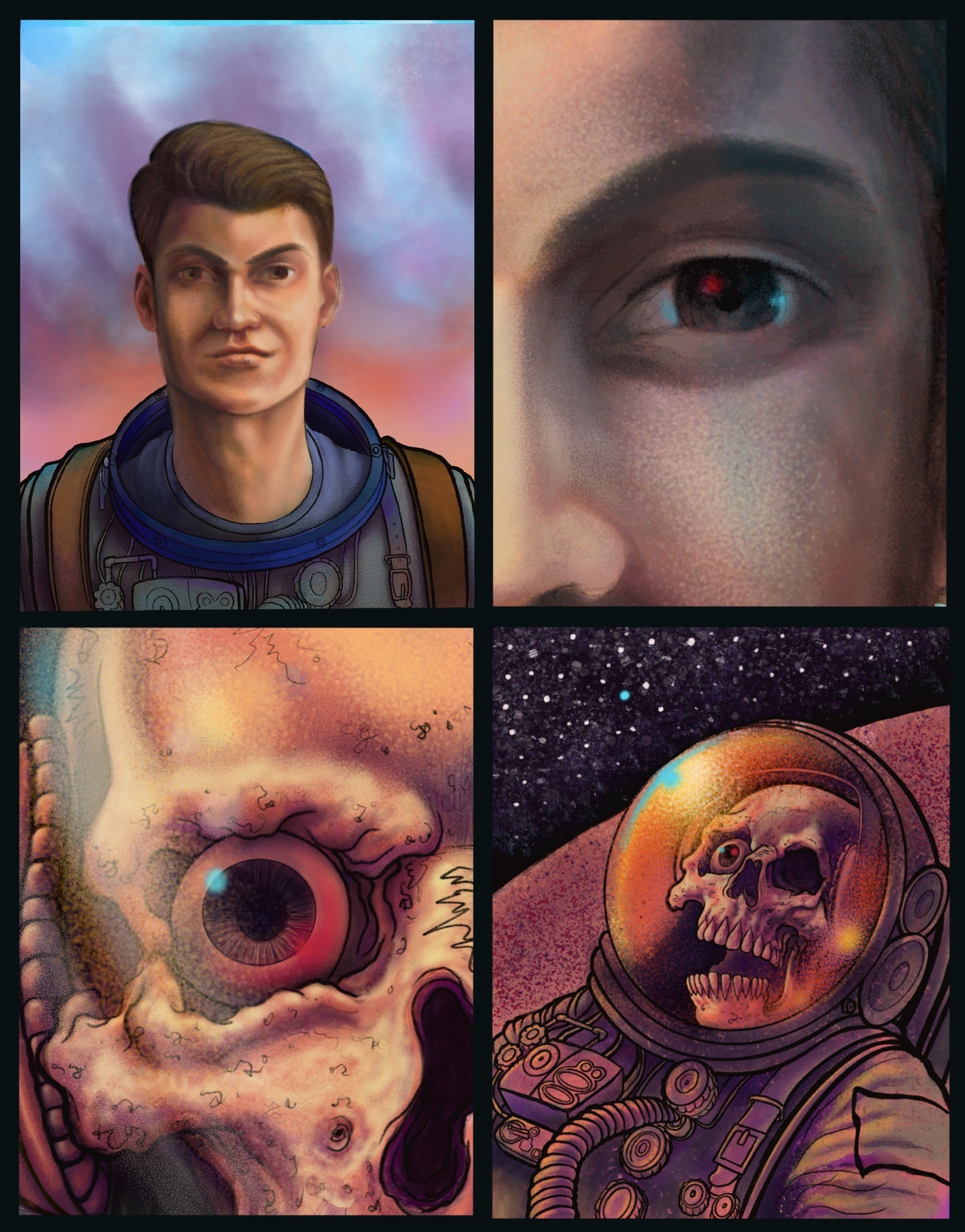 A four-panel illustration that responds to the prompt “The Grass is Always Greener” and tells the story of a young aspiring astronaut who has his sights set on Mars. The final panel has a small blue dot, which represents a reflection of his past.