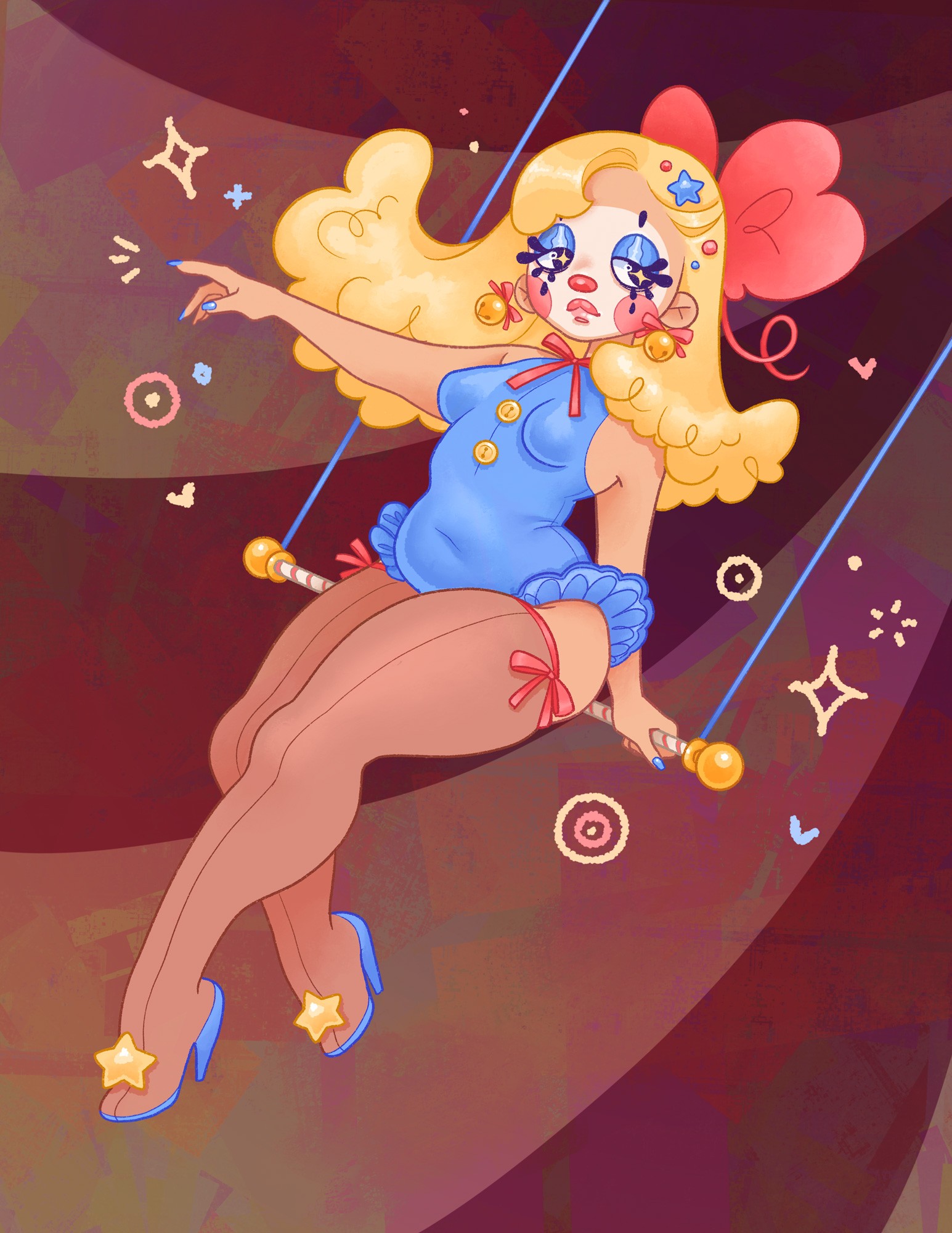 Pin-up illustration of a clown trapeze artist illustrated for a client.