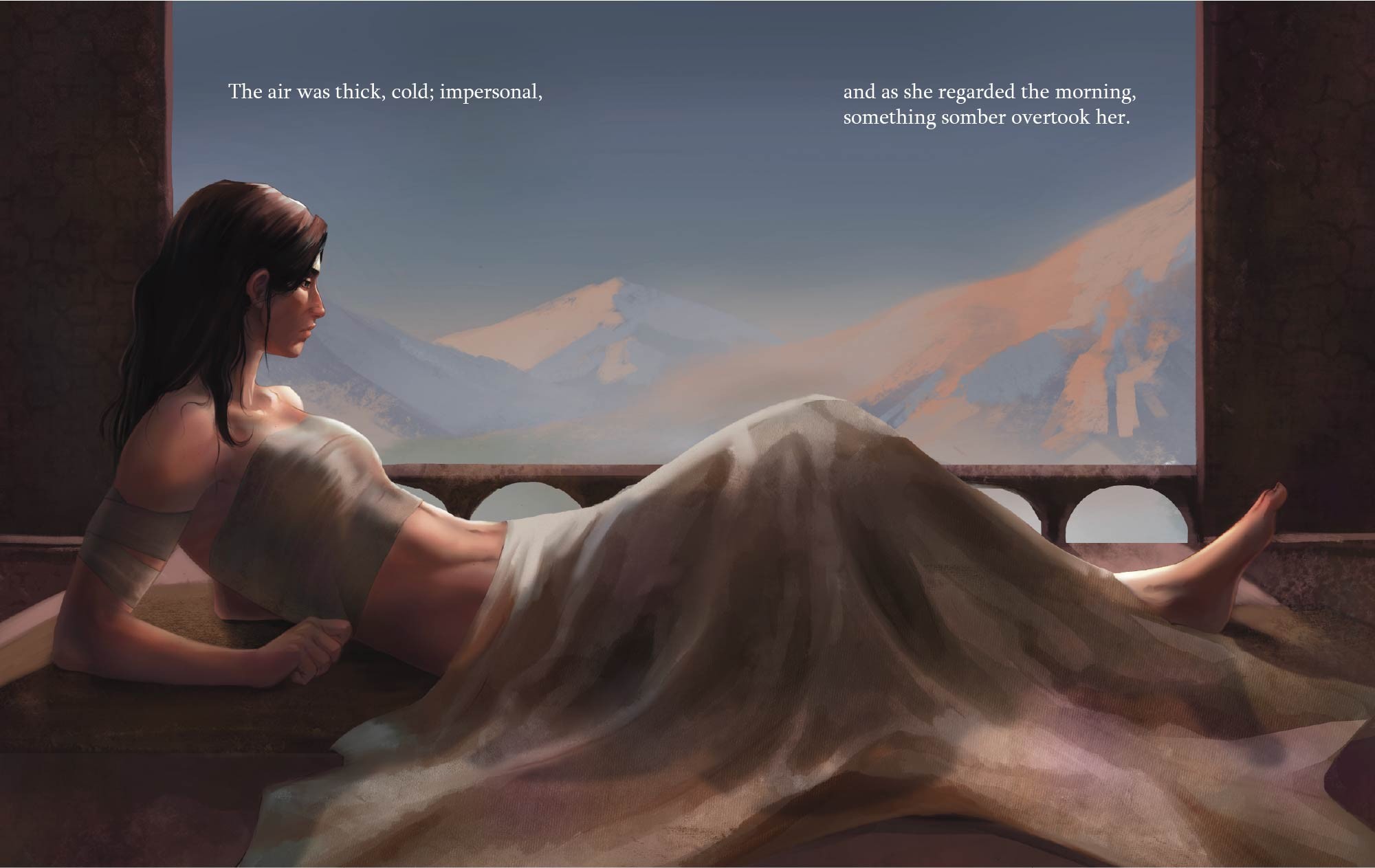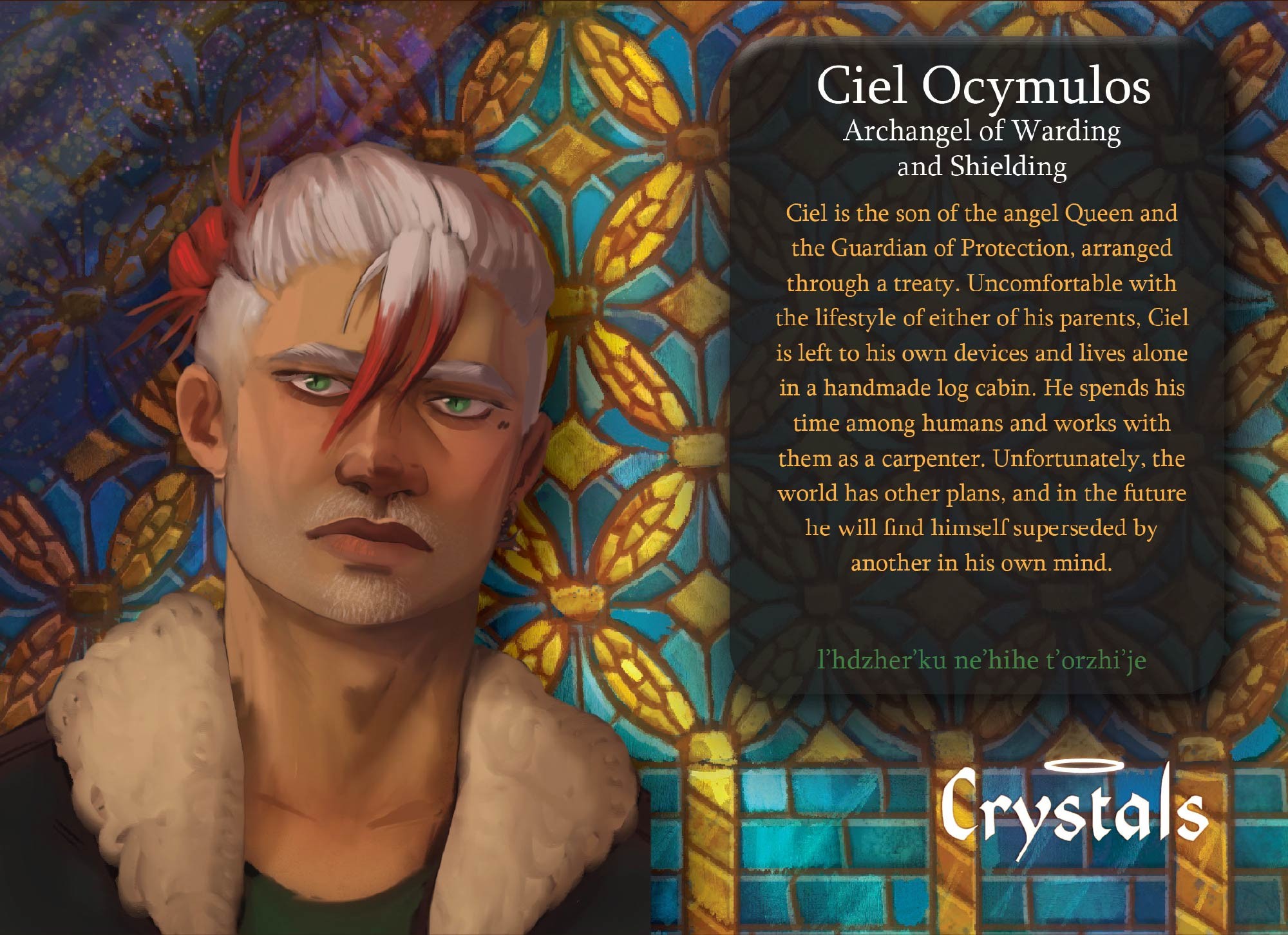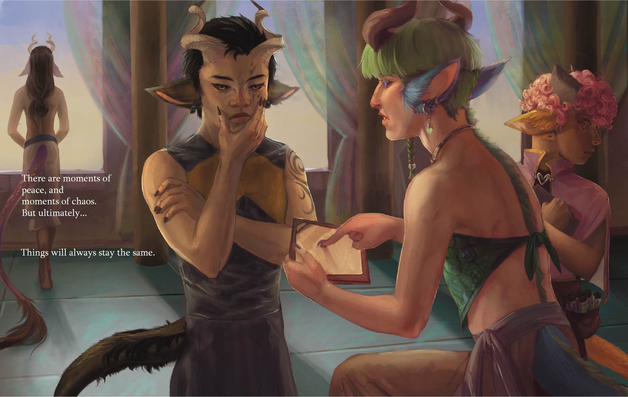 A set of four chapter illustrations that will be paired in the future with content from the novel Crystals. Two moments of peace and two moments of turmoil were the chosen subject matter. Character cards were a necessary addition to this project, giving the viewer further insight into the lives and personalities of the people in the illustrations.