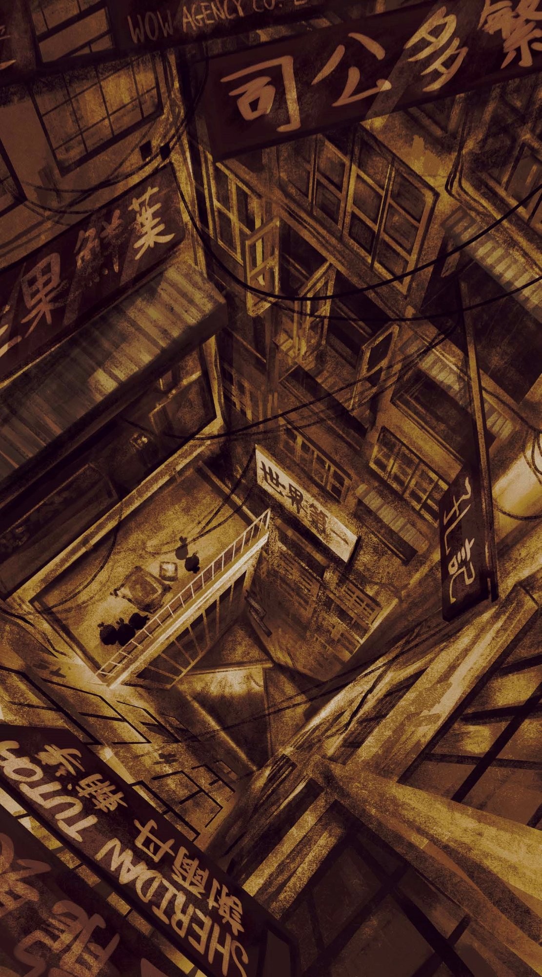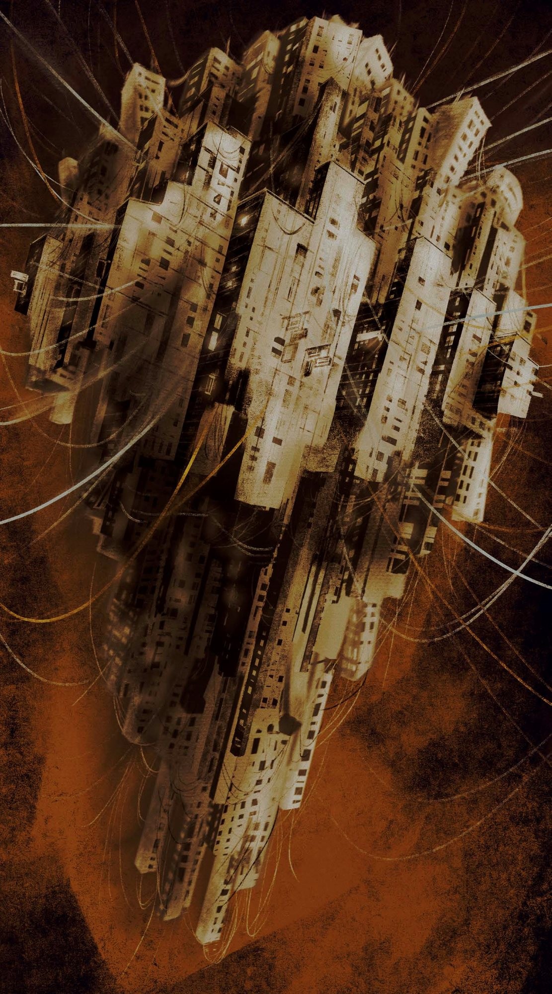 Inspired by the infamous Kowloon Walled City, this piece delves into a hypothetical scenario in which the city itself is suspended in the sky, exaggerating its height and claustrophobic nature.