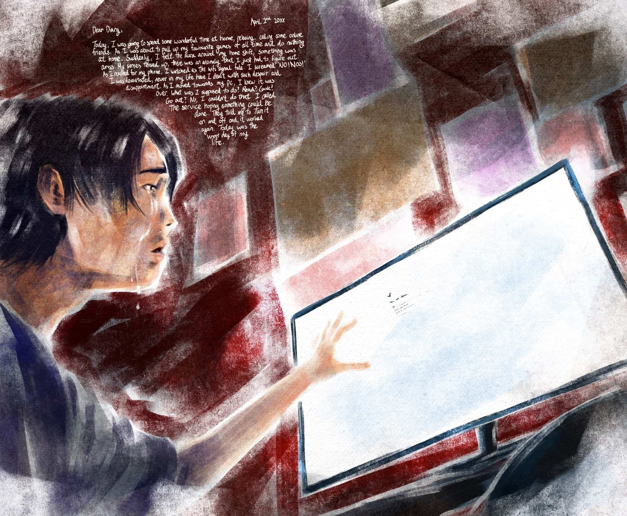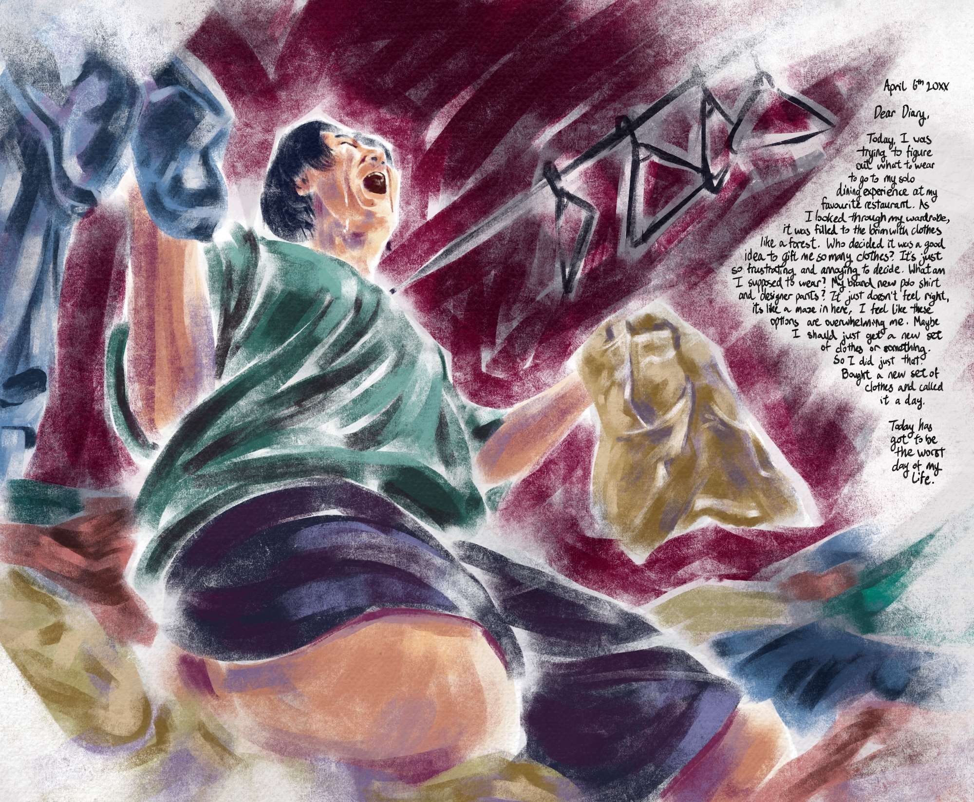 This visual diary pokes fun at the trivial problems we may encounter in our day-to-day lives, exaggerating them. First-world problems, overblown.