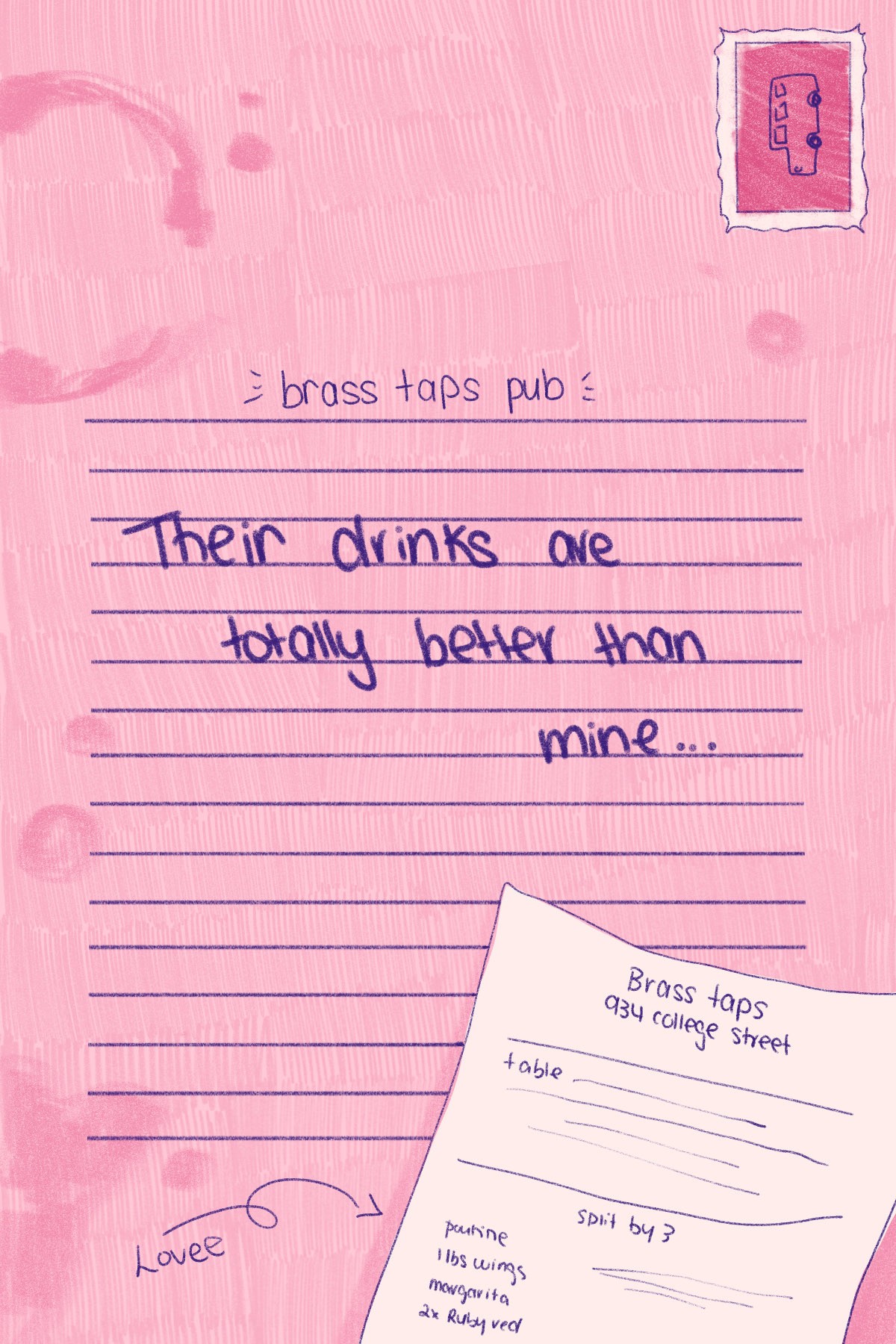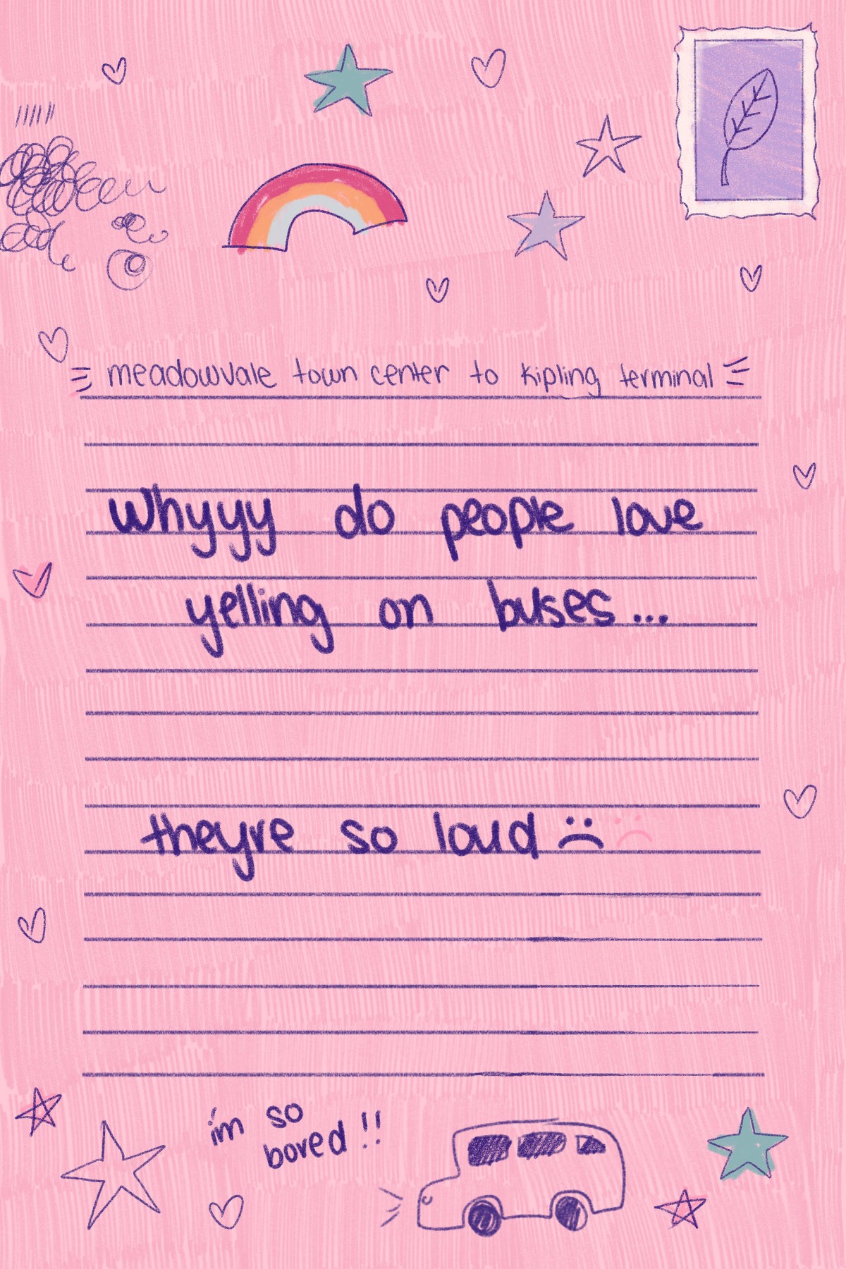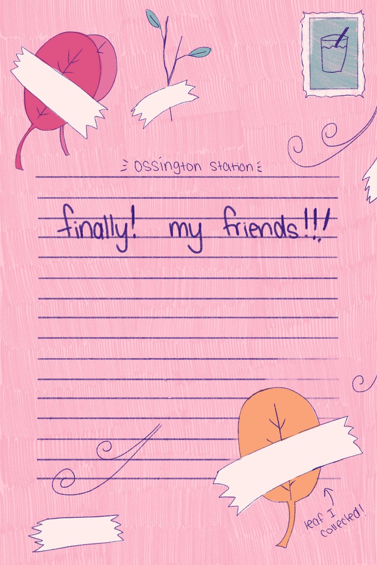A narrative postcard series illustrating a trip Julia took to meet up with her friends, featuring her real-time thoughts during some key moments of her journey.