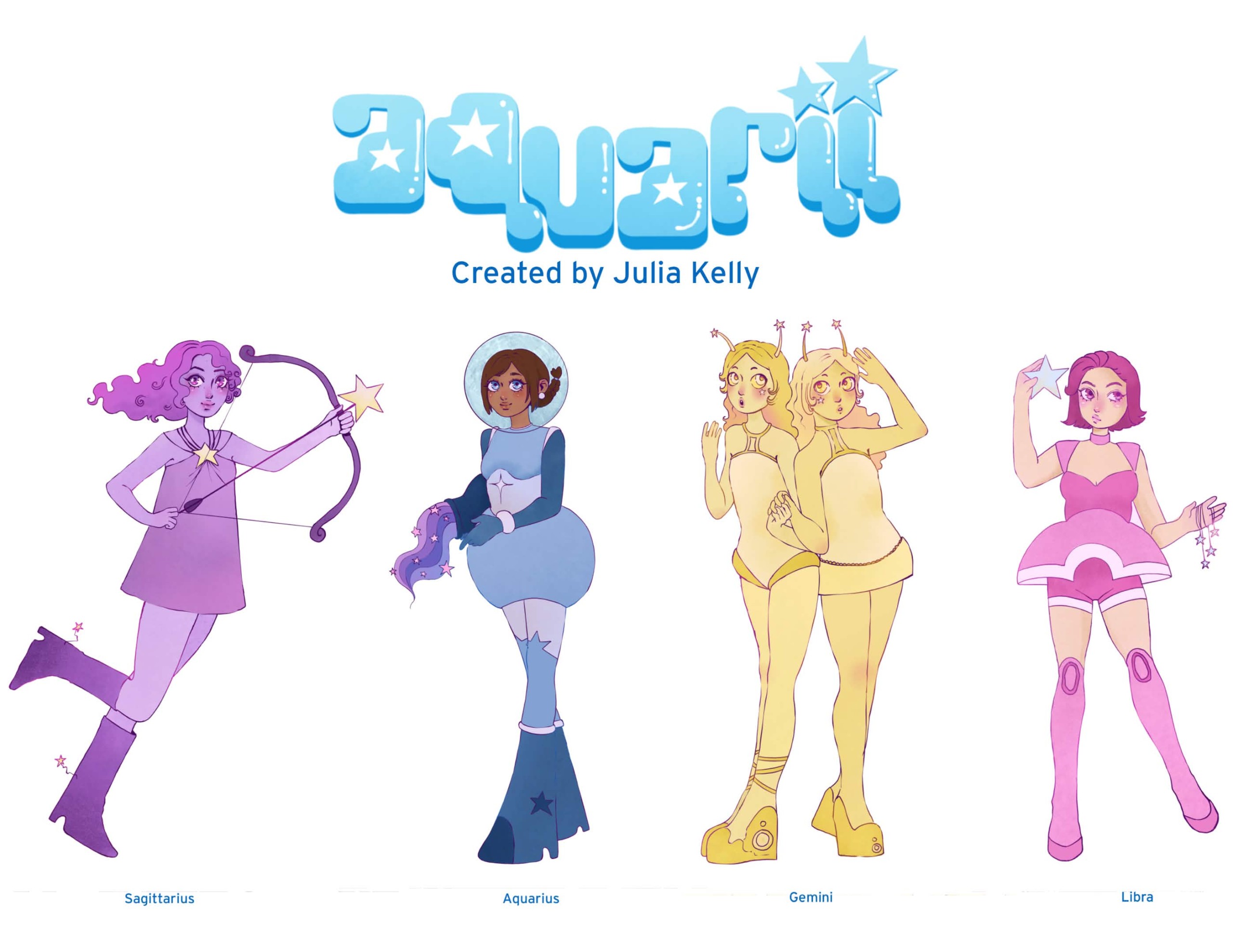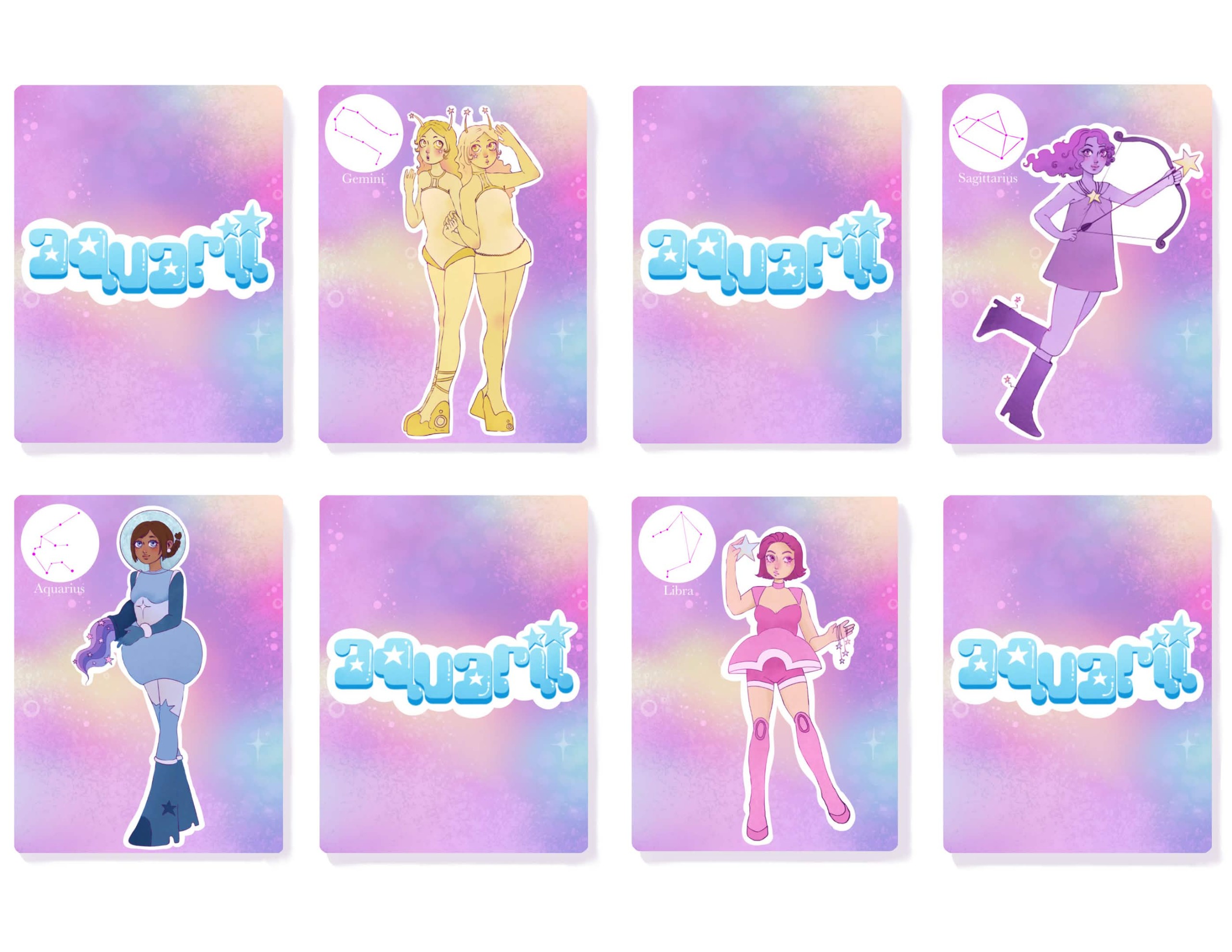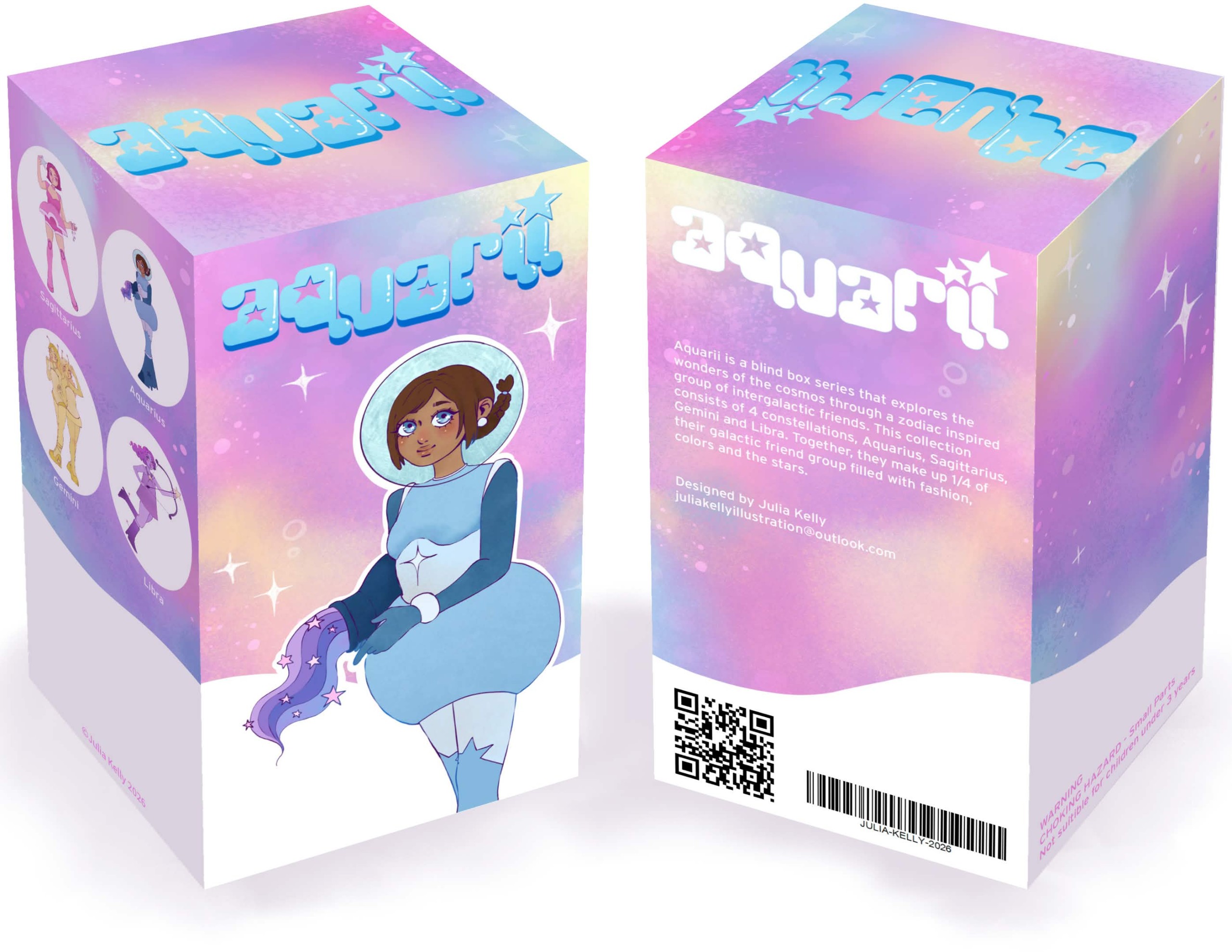 A blind box series inspired by the zodiac constellations. Features four of the twelve star signs reimagined as intergalactic friends. This project includes four figurine designs, character cards and a box for them to go in.