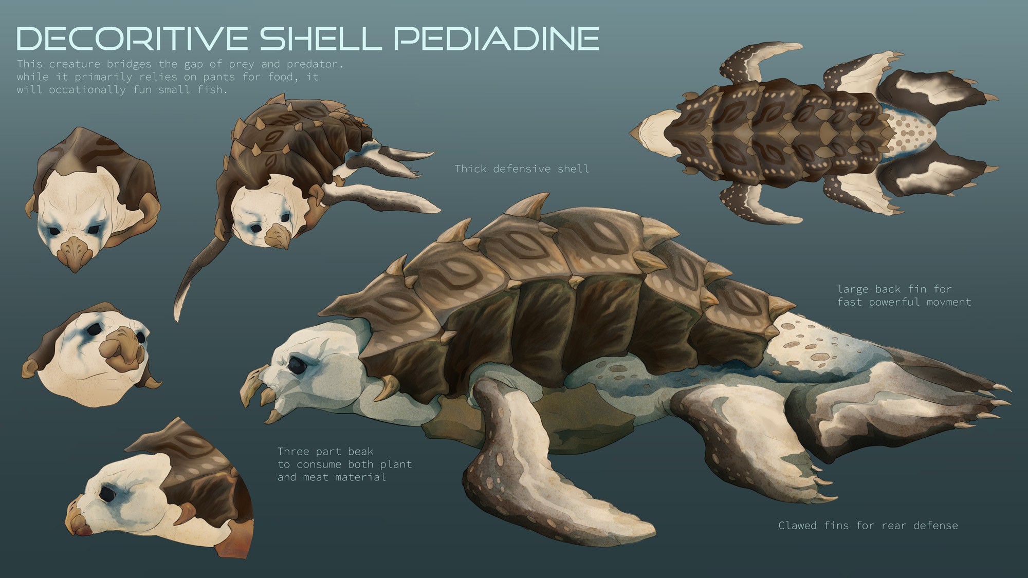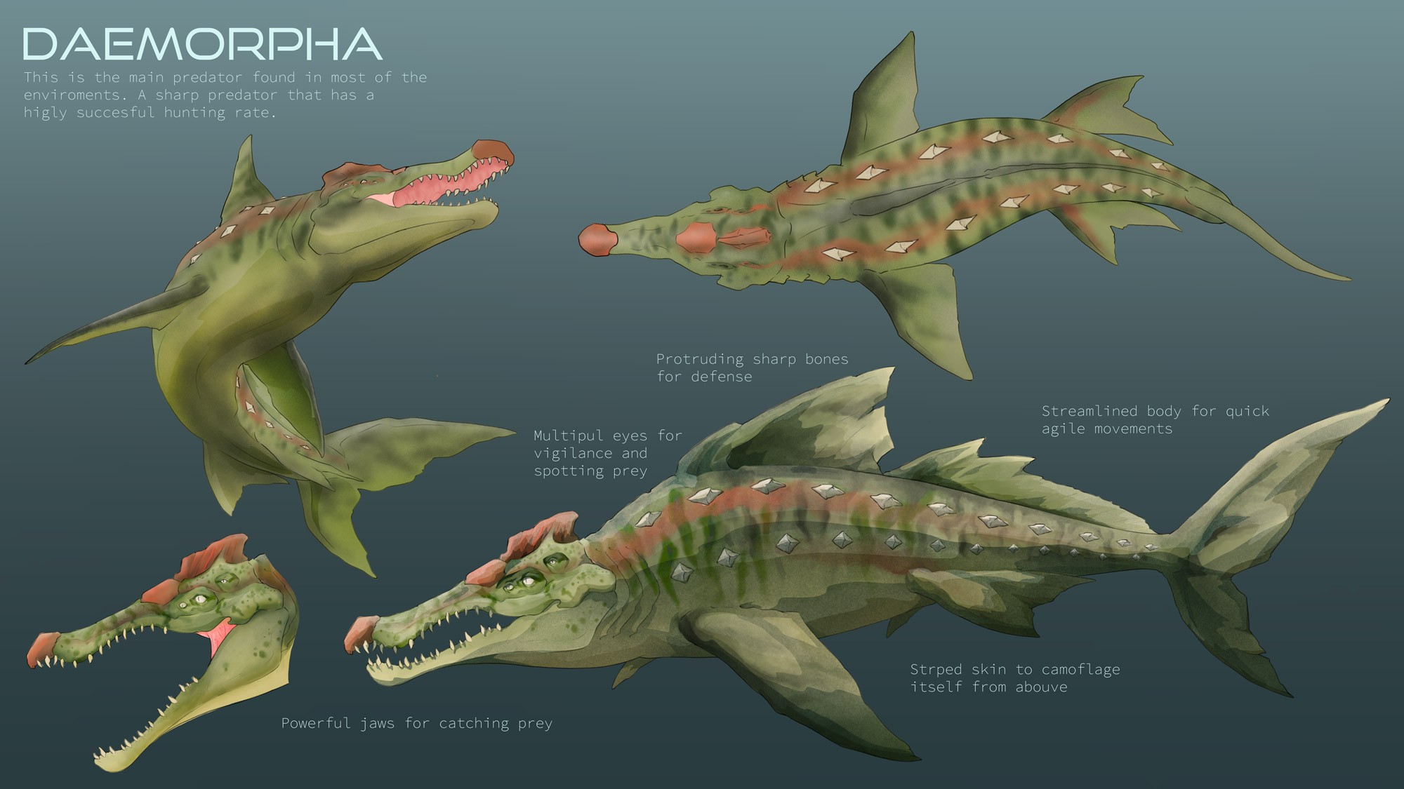 A visual development package for an underwater survival game set on an alien planet. Players take on the role of one of several creatures navigating a hostile environment filled with predators and deadly plants. The package includes a set of creature, environment, and trap/item designs.