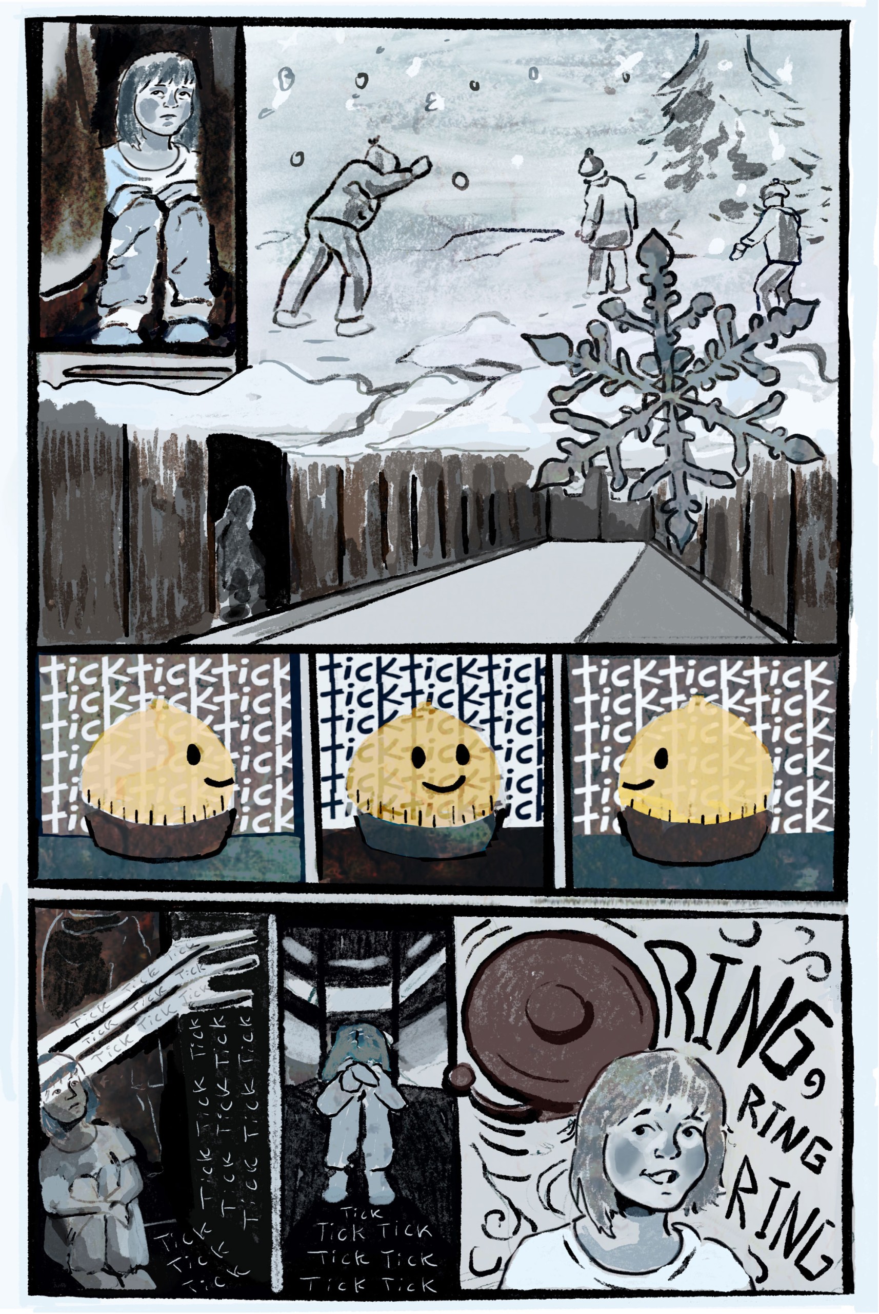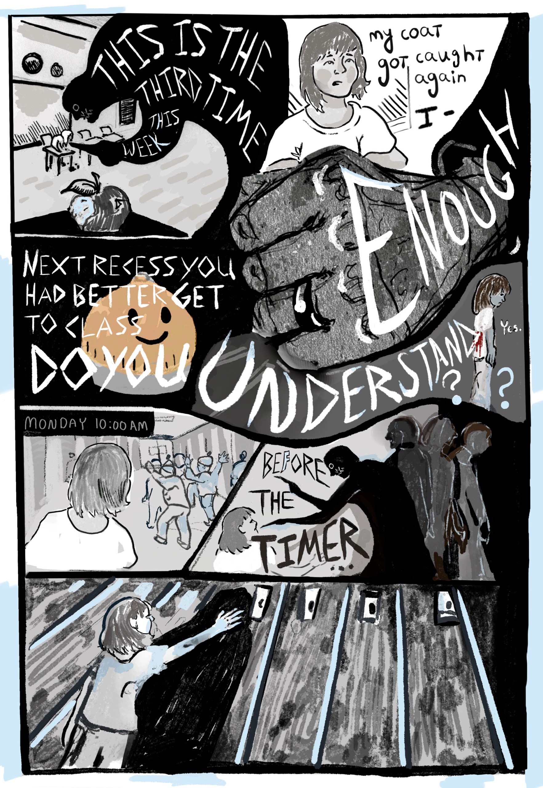 A short personal comic on an experience from grade school that touches on the proverb, “Out of sight, out of mind.” Students often got detention for taking too long to change out of their winter gear. Apparently, hiding in lockers didn’t do the trick.