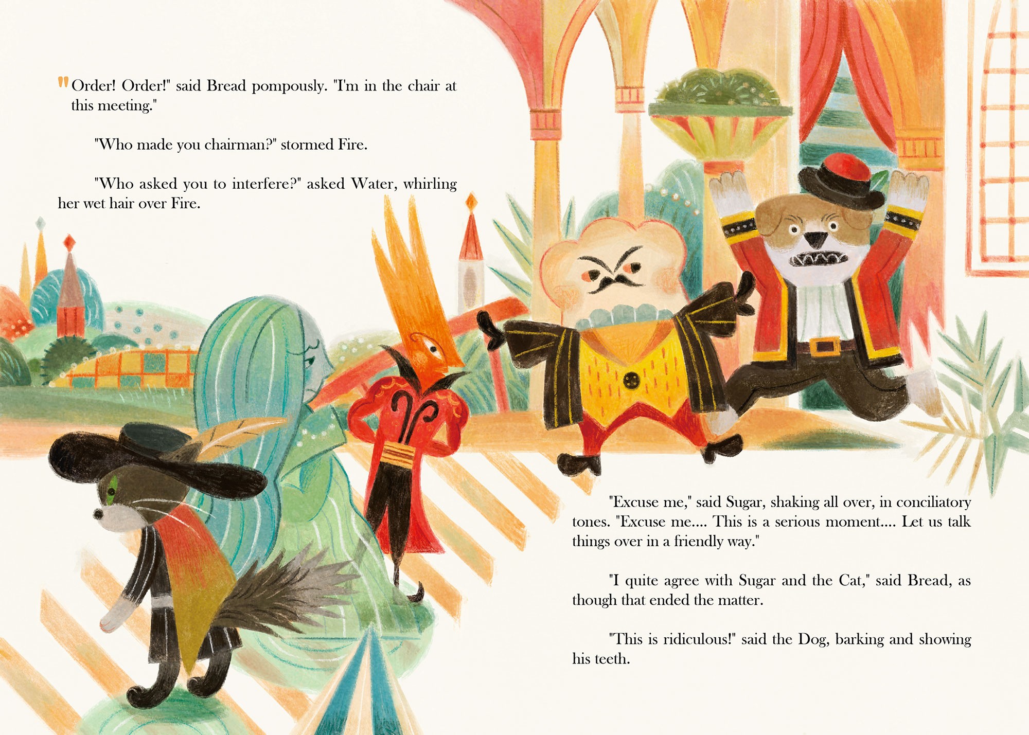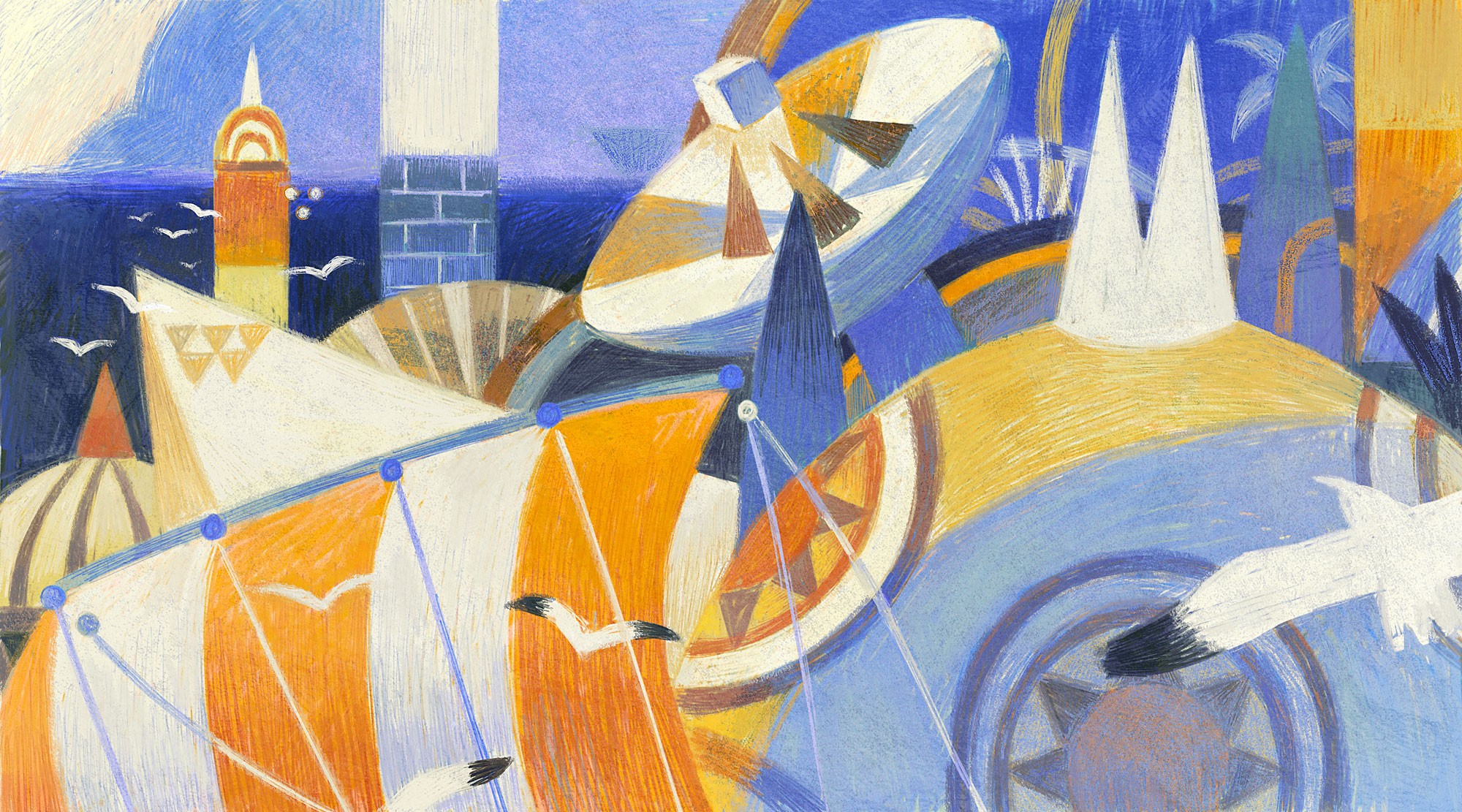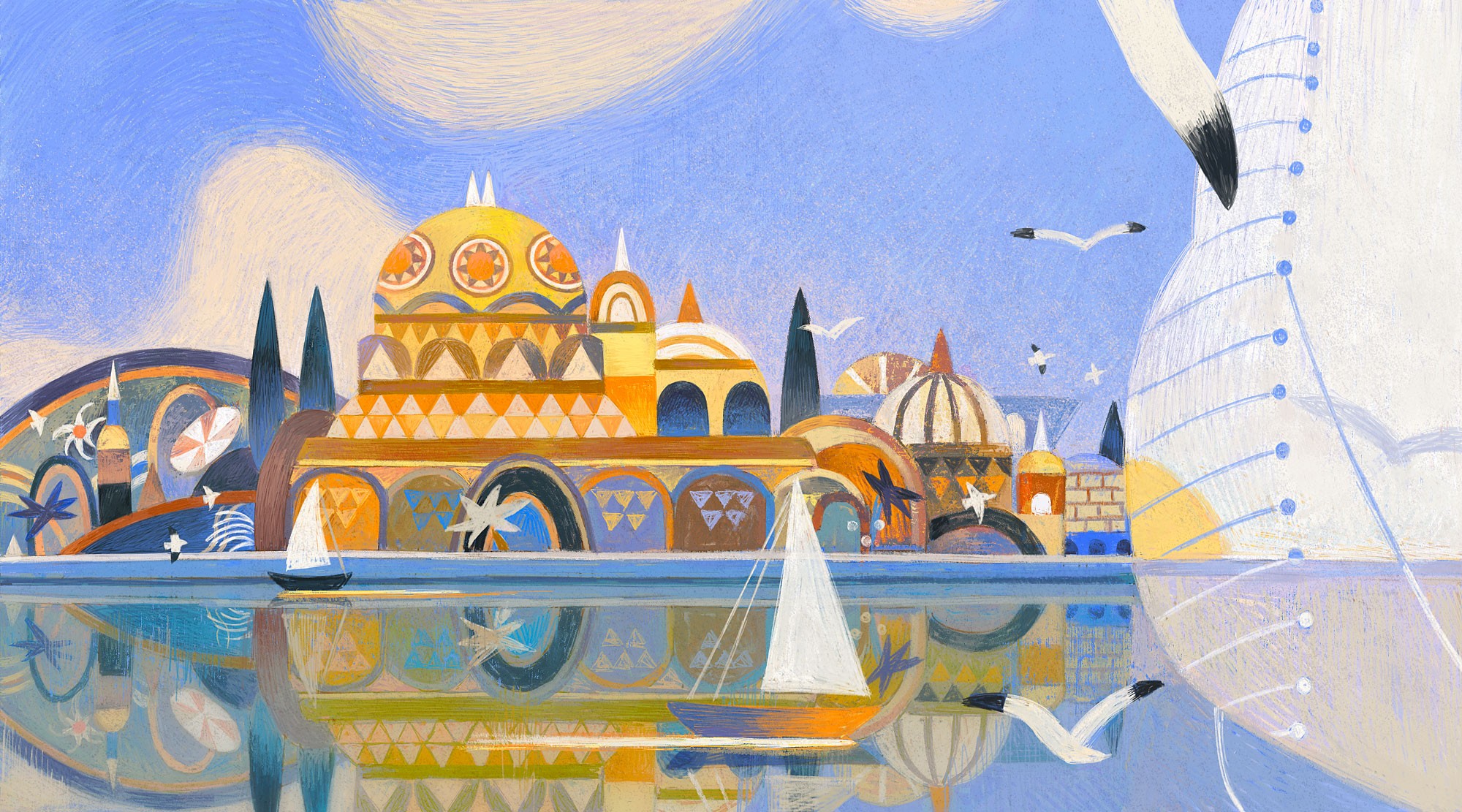 Illustrations inspired by a short story that involves a breathtaking desert city. Quietly sitting under the bright sun, the city bridges across the oasis and sea.