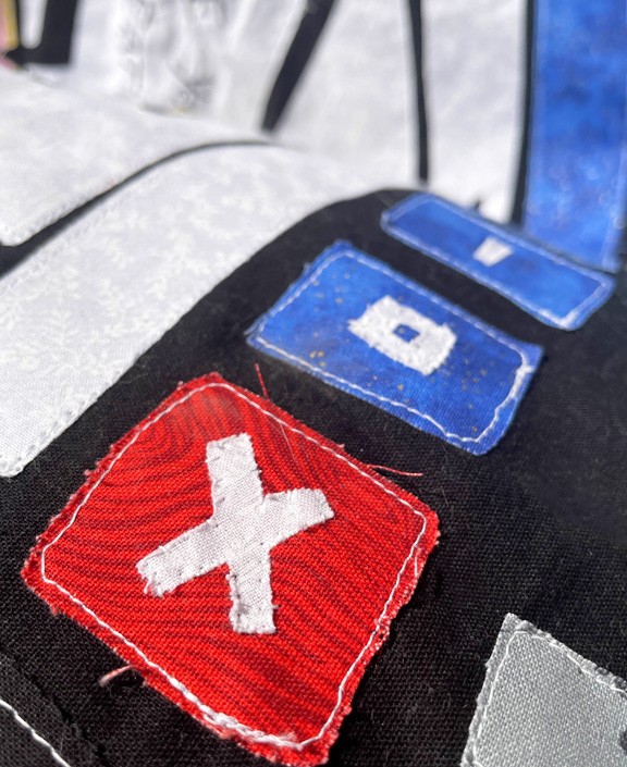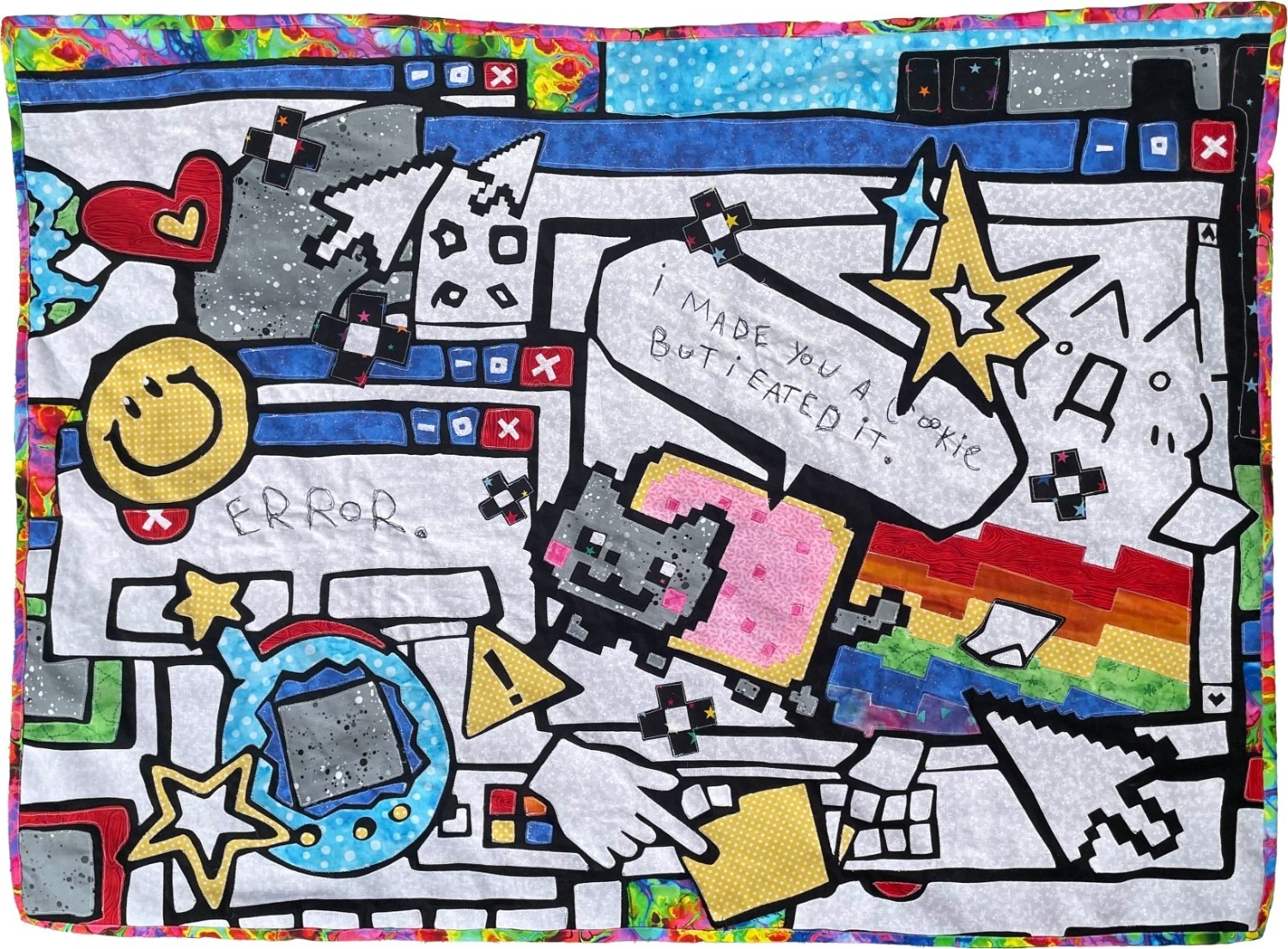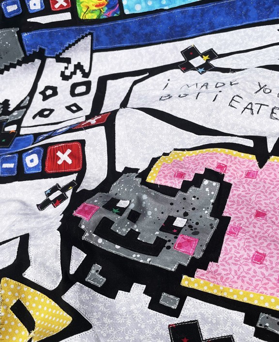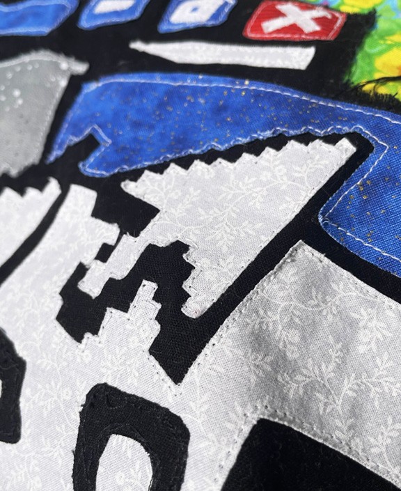 In a modern, juxtaposed twist, this quilt represents nostalgia and growing up in a new digital era. Using bold maximalist shapes, this appliqué design documents trends that may fade over time, while aiming to endure beyond our generation.